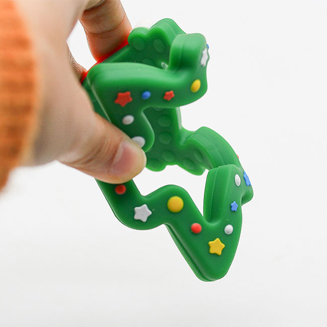 而且與其他牙膠不一樣的是,圣誕樹牙膠有著許多凹凸不平的顆粒,這些顆??梢园茨ρ来?,也可以幫助寶寶緩解各種的不適。